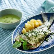 Menu: Crème de laitue, bar et pommes de terre en sauce au cresson