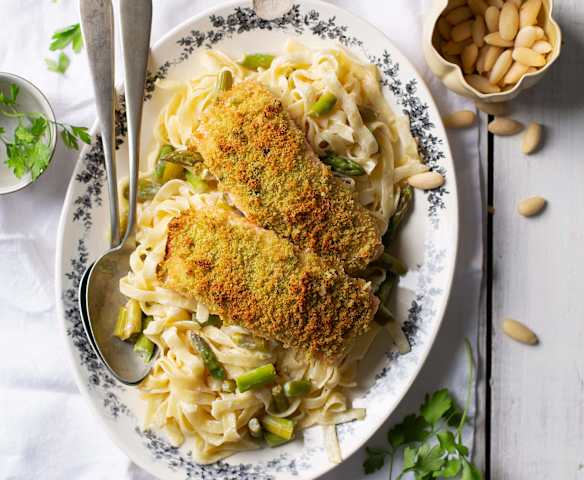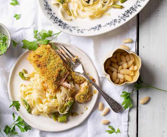 Salmone in crosta di mandorle con tagliatelle agli asparagi