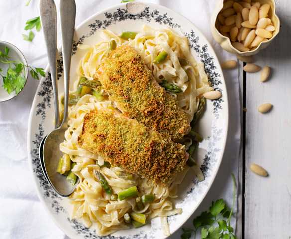 Salmone in crosta di mandorle con tagliatelle agli asparagi