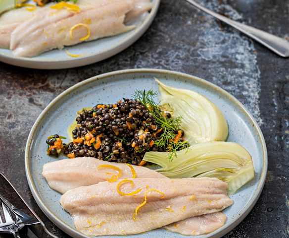 Filetti di trota su lenticchie Beluga con finocchio e vinaigrette vegetale
