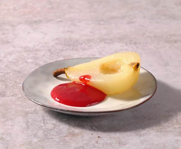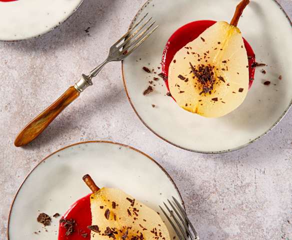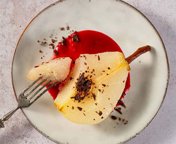 Pere al vapore con salsa di lamponi e cioccolato fondente