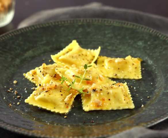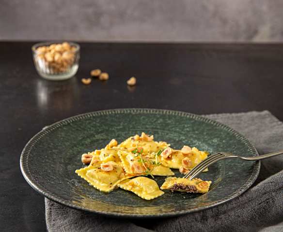 Ravioli ripieni di ricotta e caffè con burro e nocciole