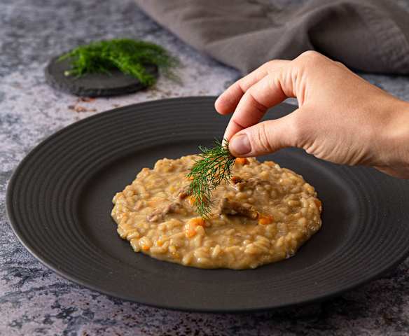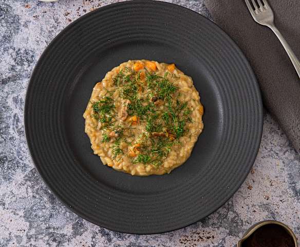 Risotto al caffè con zucca, funghi porcini e trito di finocchio selvatico