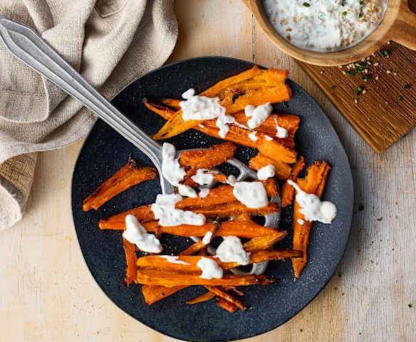 Smashed Carrots mit Sesam-Joghurt-Creme