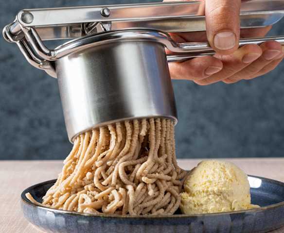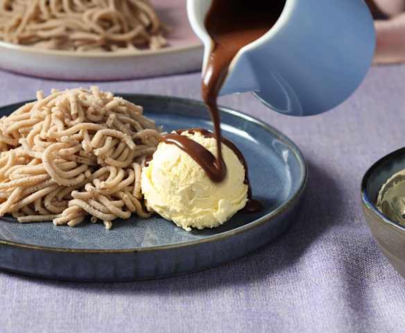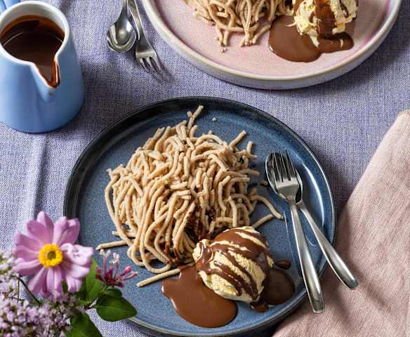 Maronireis mit Vanilleeis und Schokosauce