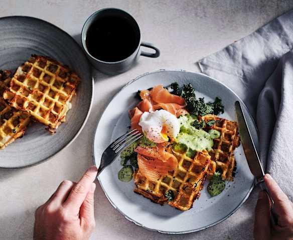 Chunky potato waffles with salmon and crispy kale