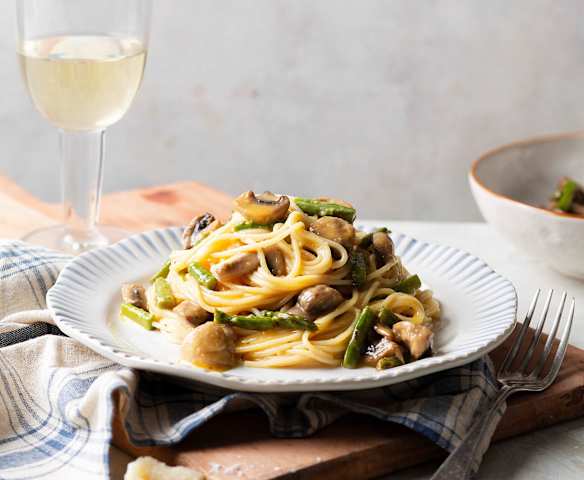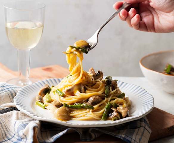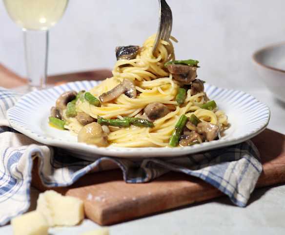 Espaguetis a la carbonara a baja temperatura con espárragos y champiñones