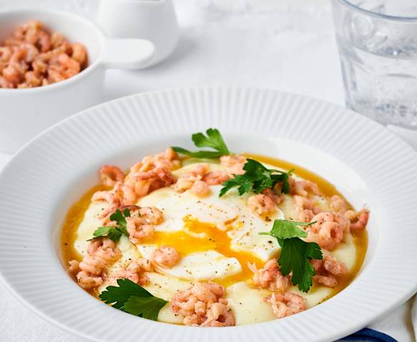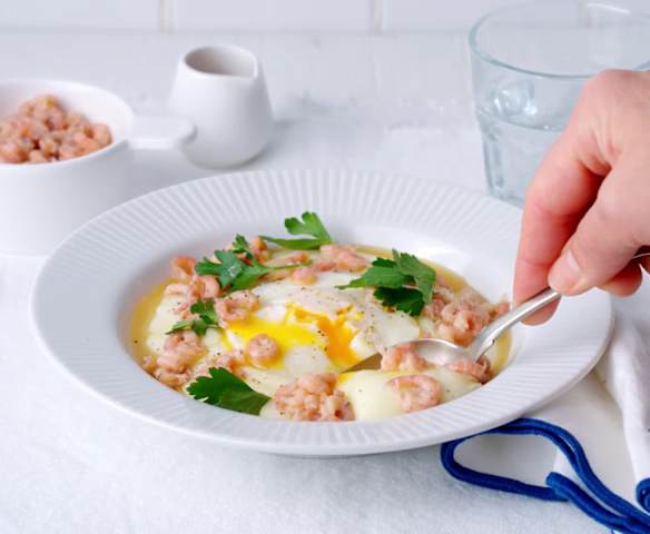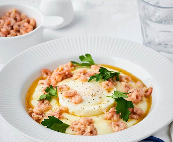 Purée de Pommes de Terre au Babeurre avec des Oeufs Pochés et Crevettes